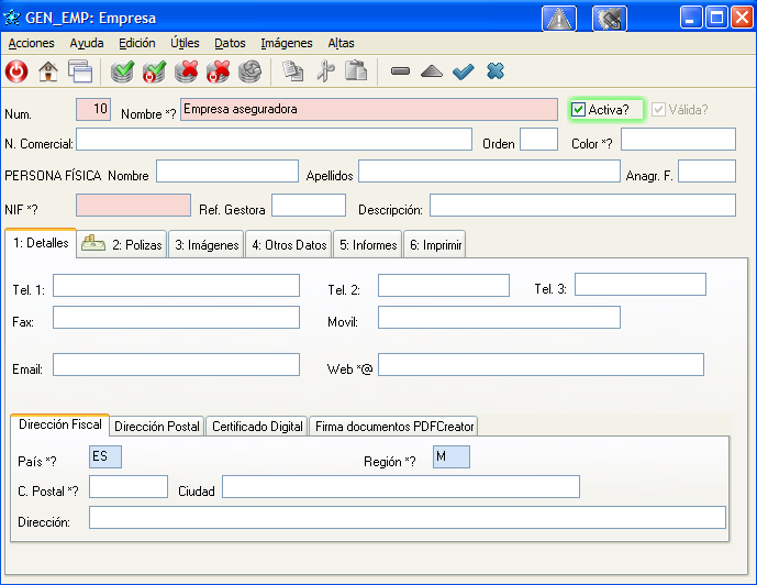 En este apartado daremos de alta la empresa gestora del fondo de pensiones o la aseguradora del mismo. En este formulario indicaremos los datos de la empresa. En la pestaña de Pólizas se muestran todas las pólizas asociadas a esa empresa. Enlaces transversales de Book para Manual de Criterium CIS ‹ Manual de Criterium CIS Arriba Cuentas de tesorería de pago › Versión para impresión