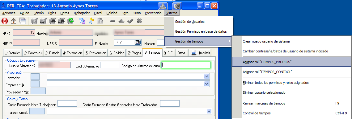 Una vez dado de alta el trabajador tenemos que dar de alta el usuario de base de datos y asignarlo al trabajador. Se utiliza el menú Sistema.