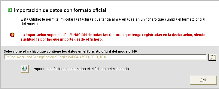 También puede realizar la importación de todos los datos, declarante, declaración y detalle de facturas de una sola vez. Para eso utilice la opción Importar ficheros con formato Oficial.