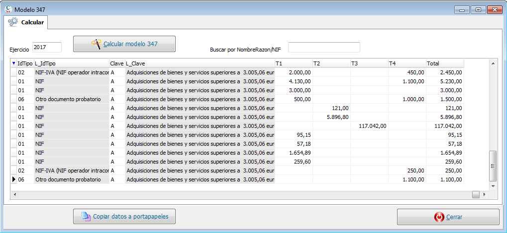 En el formulario que se muestra se pueden calcular el volumen de operaciones, divide por trimestres, aunque calcula de todos los clientes y proveedores sin discriminar por importe. Tenga en cuenta que se utiliza el valor de ImproteTotal.